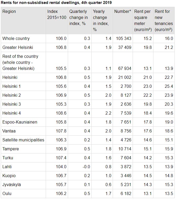 Statistics Finland has released its latest quarterly figures on rents of dwellings, which are based on data from private rental housing companies and the Social Insurance Institution (Kela) aid register.