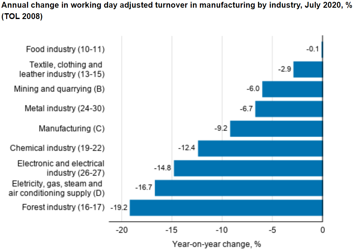 According to Statistics Finland, working day adjusted turnover decreased in July by 10.3% year-on-year in all main Finnish industries.