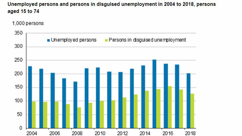 The number of persons in disguised unemployment decreased by 15,000 from 2017. In 2018, there were 128,000 working-age persons aged 15 to 74 classified as being in disguised unemployment, who would and could have accepted work, but had not looked for it actively.